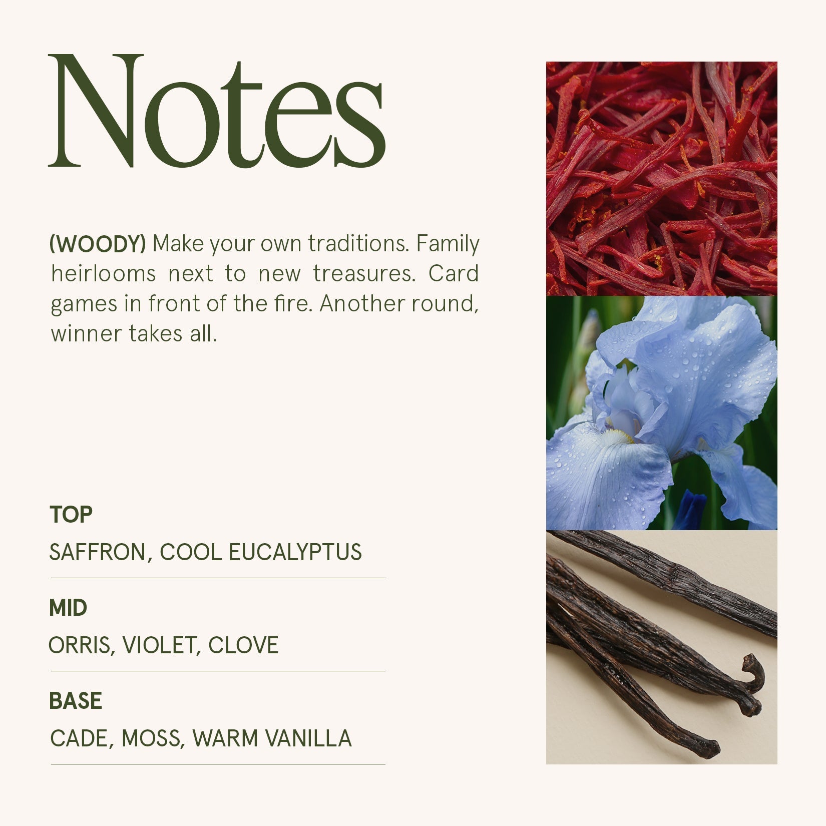 Base Notes: Cade, Moss, Warm Vanilla