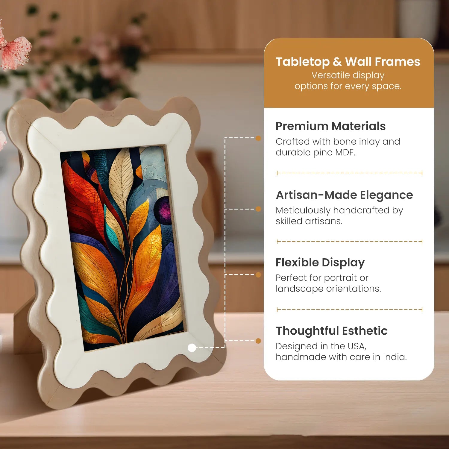 With its eye-catching scalloped edge and warm neutral tones, this decorative photo frame fits effortlessly into a range of interior styles—whether it's rustic farmhouse, cozy boho, or clean contemporary. Ideal for tabletop use or wall display, it enhances any setting, from living room walls to office shelves, bedside tables, or entryway consoles.