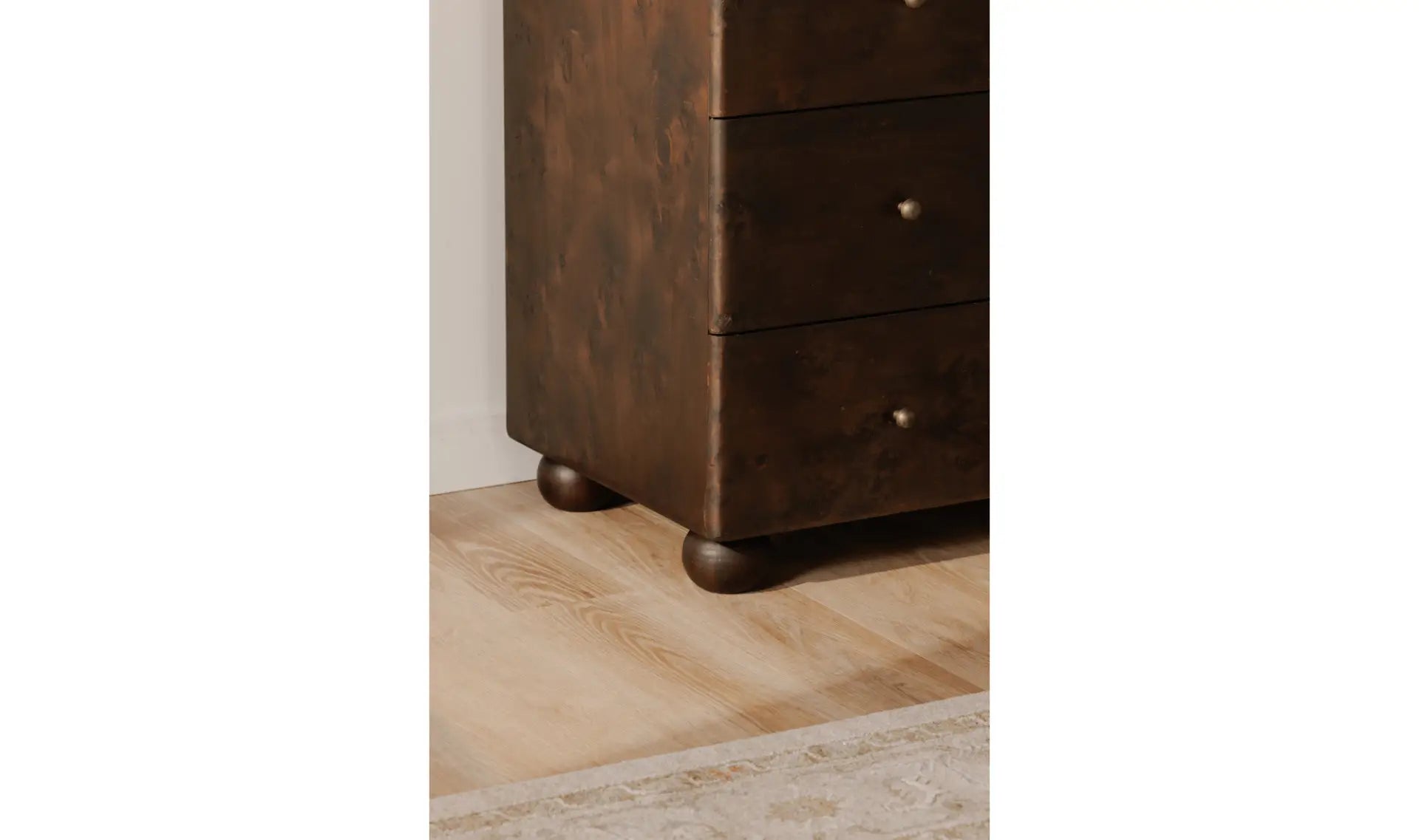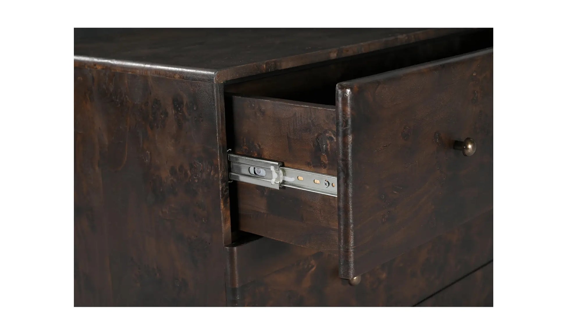 Elegant craftsmanship meets everyday practicality — this piece features a burl veneer over MDF with a matte medium brown finish and brass handles for subtle sophistication. Acacia wood legs provide sturdy support, while soft-close drawers and a tip-over restraint ensure safety and smooth functionality without compromising style.